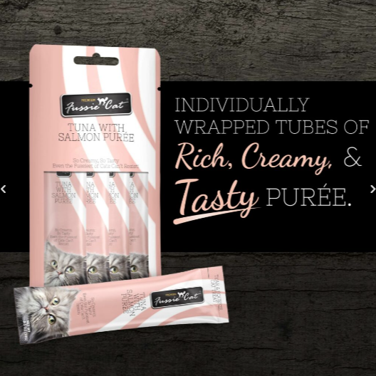 Fussie Cat Tuna with Salmon Purée is love at first lick. Creamy in texture and rich in taste, this indulgent, flavorsome puree will make even the Fussiest of Cats demand more! Fussie Cat Tuna with Salmon Purée is an easy-to-feed cat treat with essential vitamin E for your cat’s diet to support healthy skin and coat.